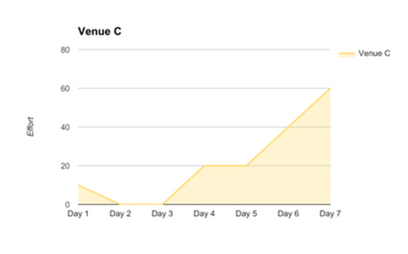I used these proto-personas, and what we’d gathered from our interviewees to put together a series of graphs that showed effort and communication levels over time. This didn’t take much time to put together, but it had a big impact on our client’s understanding of his place in the market.