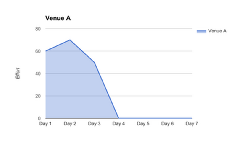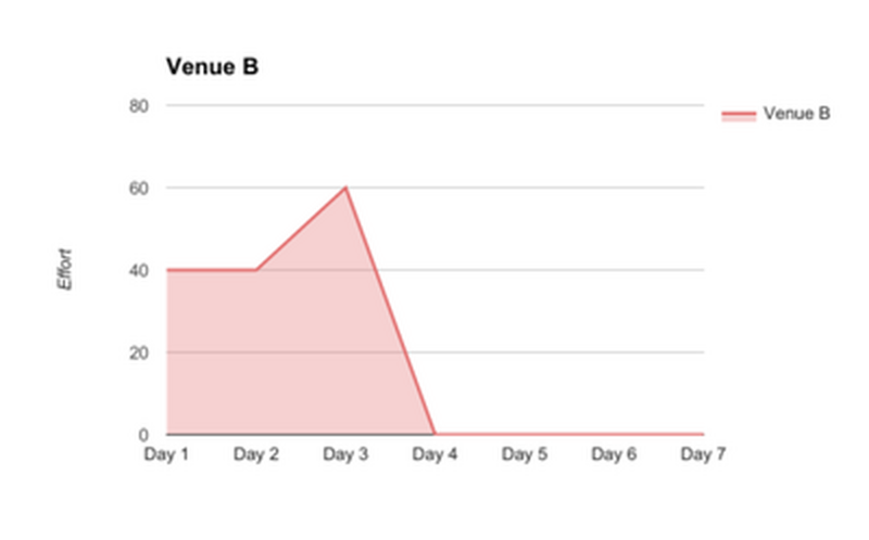 I used these proto-personas, and what we’d gathered from our interviewees to put together a series of graphs that showed effort and communication levels over time. This didn’t take much time to put together, but it had a big impact on our client’s understanding of his place in the market.