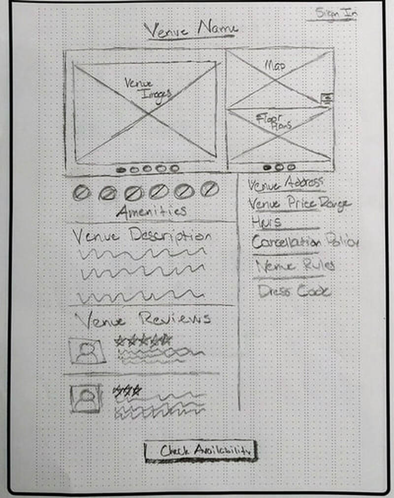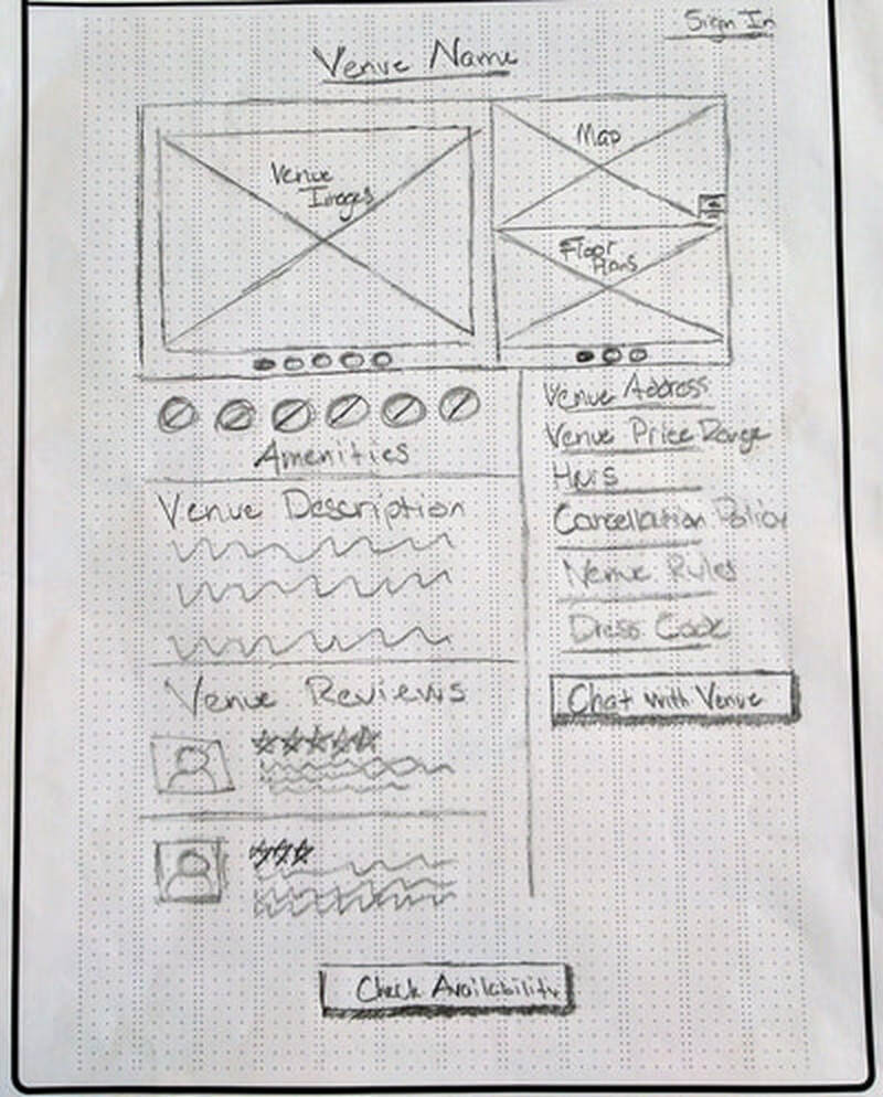 His product is a room reservation system that makes finding a room for a meeting or social event dead simple. He knew a lot about this from his time in school, planning with his MBA cohort. He presented us the challenge of redesigning how users on the renter side (vs the venue side) requested proposals and researched venues.